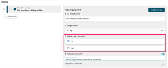 Når du har skrevet dit spørgsmål og valgt svartypen, skal du angive hvad der er det korrekte svar i nr. 3 Vælg korrekt besvarelse
