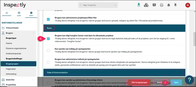 Konto ➜ Brugere ➜ Brugergruppe ➜ Tryk på blyanten ud for brugergruppen ➜ Tryk på fanebladet ”Rettigheder” ➜ Basis: Sæt flueben ud for "Brugere kan tilgå Insights Center med data fra tilknyttede projekter" ➜ Gem