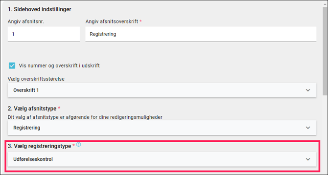 1. Start afsnit på ny side: Her kan du vælge hvorvidt det ønskede registreringsafsnit skal starte på en ny side i din "Udskriftsrapport".