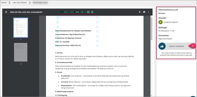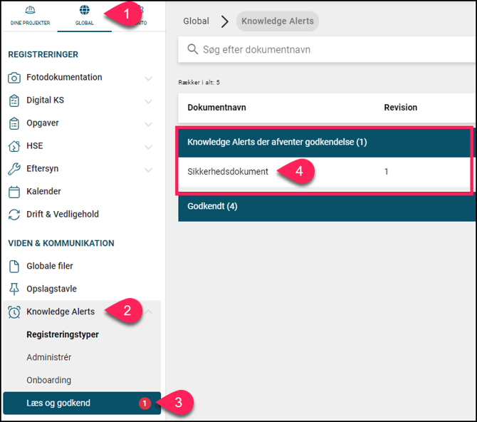 Vælg Global ➜ Tryk på "Knowledge Alerts" ➜ Vælg "Læs og Godkend" ➜ Tryk på den "Knowledge Alert" der skal godkendes ➜ Læs "Knowledge Alert" og "Swipe for at godkende".