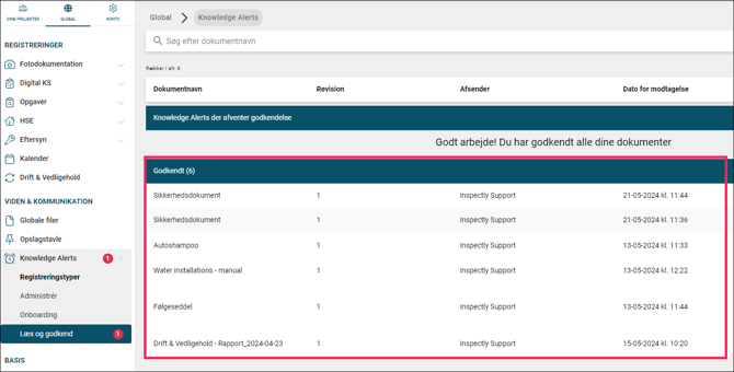 Når du har "Læst og godkendt" en "Knowledge Alert" kan du se et overblik over "Godkendte" "Knowledge Alerts".