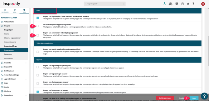 Tryk på fanebladet "Rettigheder" ➜ Scroll ned til "Basis" ➜ Sæt flueben i den/de rettighed/rettigheder du ønsker brugergruppen skal have ➜ Gem