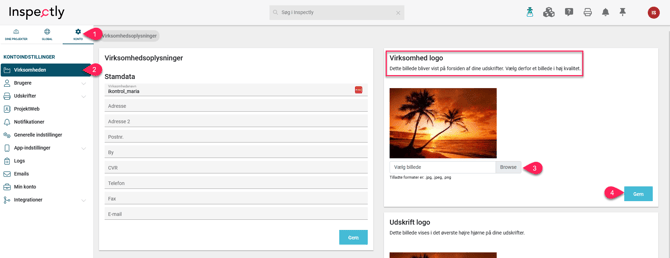 Konto ➜ Virksomheden ➜ Vælg et billede fra din computer ved at trykke på ’Browse’ ➜ Gem