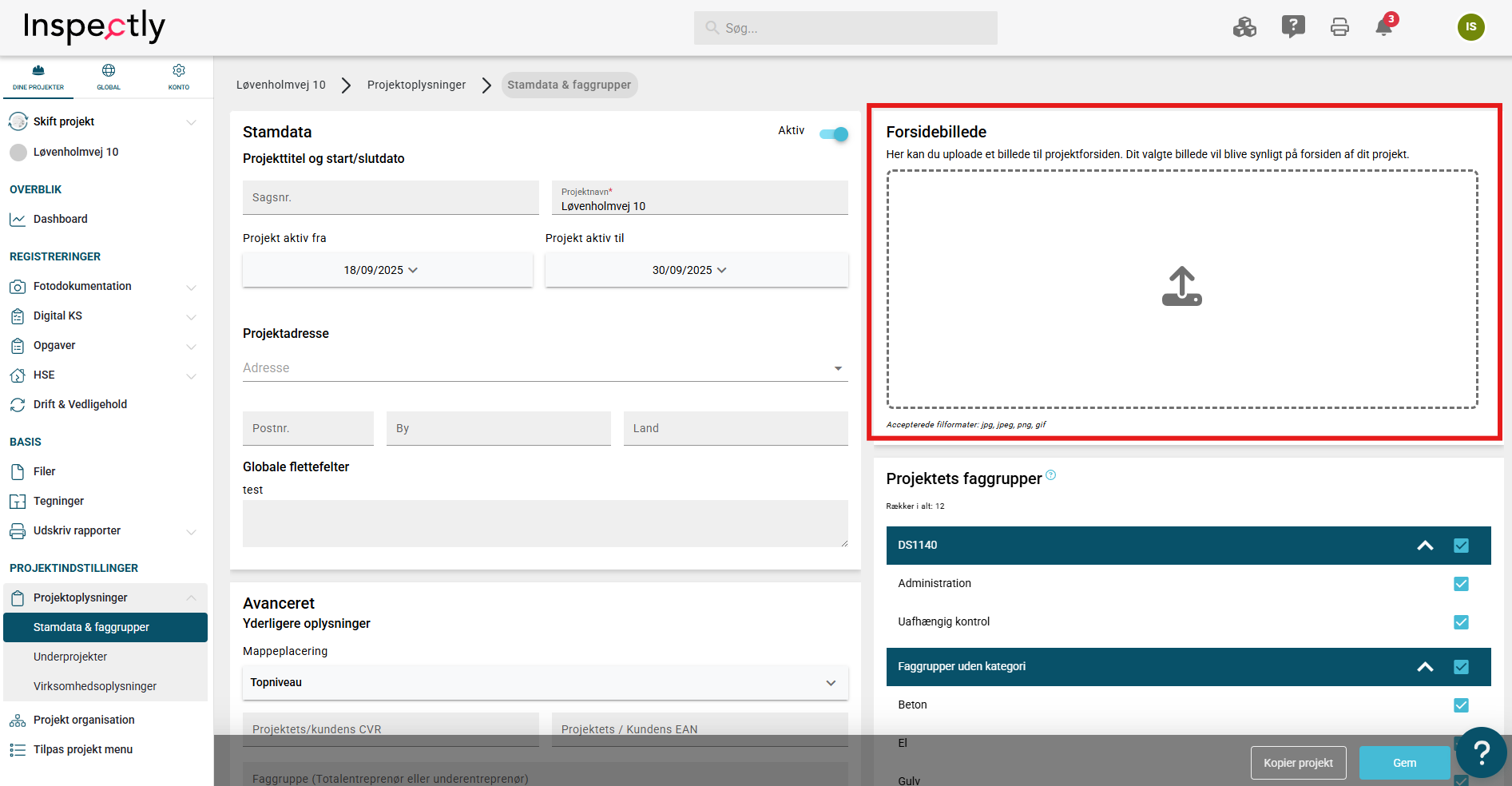 Gå til det projekt det drejer sig om ➜ Projektoplysninger ➜ Stamdata & faggrupper ➜ Vælg billede under ”Forsidebillede” ➜ Gem