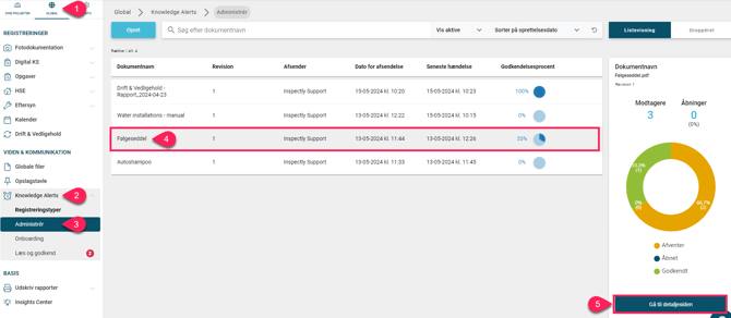 Vælg Global ➜ Tryk på "Knowledge Alerts" ➜ Vælg "Administrer" ➜ Tryk på den ønskede "Knowledge Alert" ➜ Tryk på "Gå til detaljesiden"