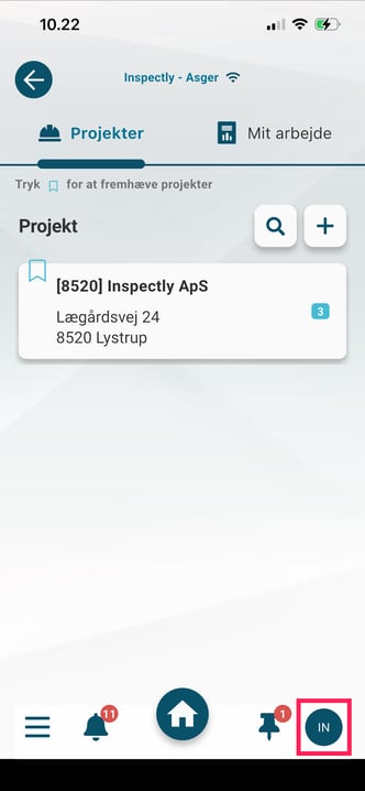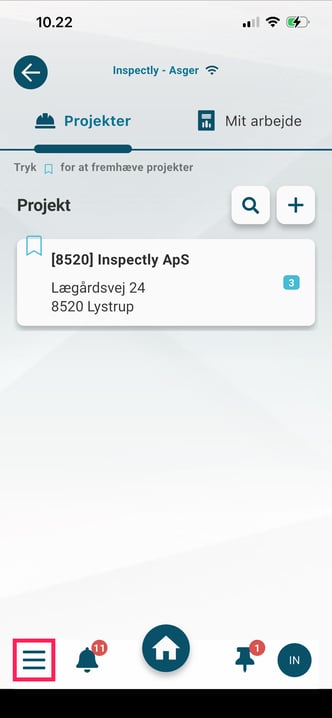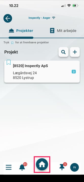 Dette er "Hjem"-knappen og fører dig tilbage til startskærmen på appen - dette kan fx være oversigten "Projekter" eller "Tile-menuen", afhængigt af hvilken startside din virksomhed har valgt at benytte.
