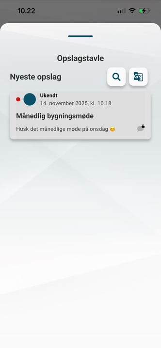 Dette er genvejen til Opslagstavlen, hvor du finder de opslag, din virksomhed har lagt op. Afhængigt af dine licenser og rettigheder er der desuden en række ekstra muligheder, som du kan læse mere om her: Opslagstavlen i appen