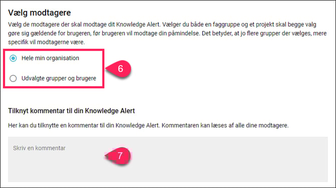 Vælg modtagere til din Onboarding Knowledge Alert og tilknyt en kommentar dine modtagere kan læse.