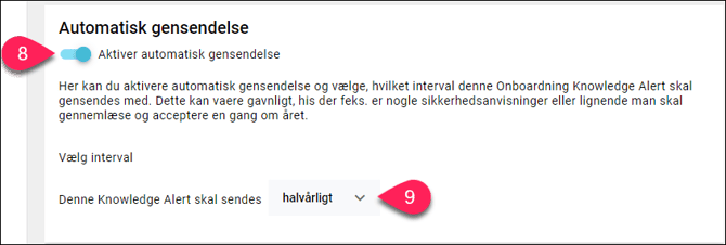 Denne funktion sikrer, at dine Onboarding Knowledge Alerts bliver genudsendt i et interval efter eget ønske. Funktionen er gavnlig, når din organisation har sikkerhedsanvisninger, der skal gennemlæses og accepteres årligt, halvårligt eller i et andet interval.