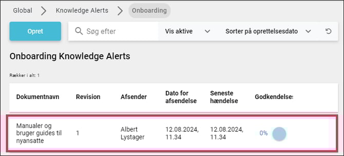 Dine aktive Onboarding Knowledge Alerts kan ses på forsiden.