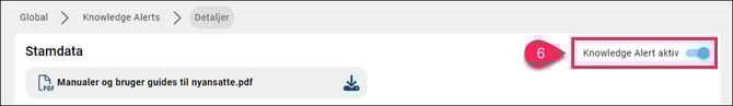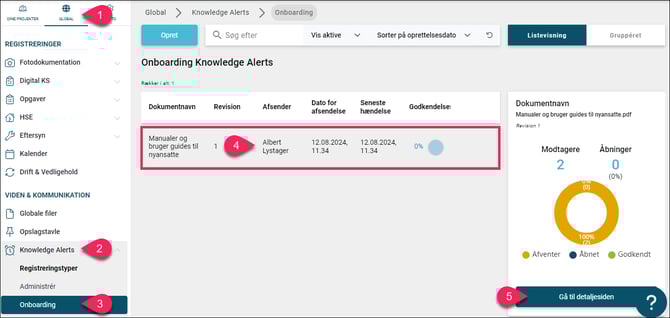 Global ➜ Knowledge Alerts ➜ Registreringstyper; Onboarding ➜ Tryk på den Onboarding Knowledge Alert der skal aktiveres/inaktiveres ➜ Tryk på "Gå til detaljesiden" ➜ Aktiver eller inaktiver din Onboarding Knowledge Alert.
