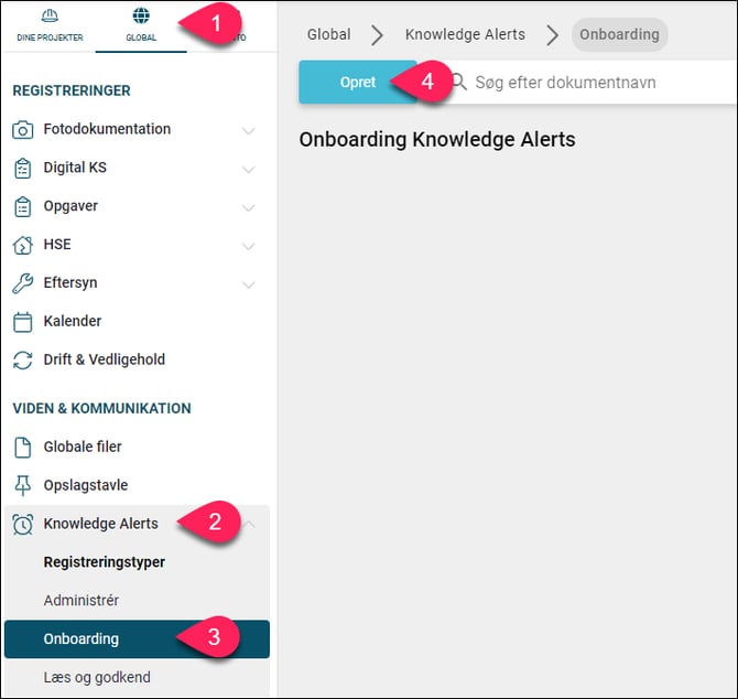 Global ➜ Knowledge Alerts ➜ Registreringstyper; Onboarding ➜ Tryk på "Opret".