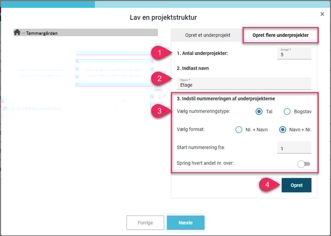 Eksempel: Vælger du navnet "Etage", nummereringstypen "Tal" og formatet "Navn + Nr.", vil underprojekterne komme til at hedde "Etage 1", "Etage 2", "Etage 3" osv.