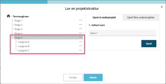 OBS! Det er også muligt at oprette og redigere i projektstrukturen igen senere, når projektet er blevet færdigoprettet, så "bordet fanger ikke".