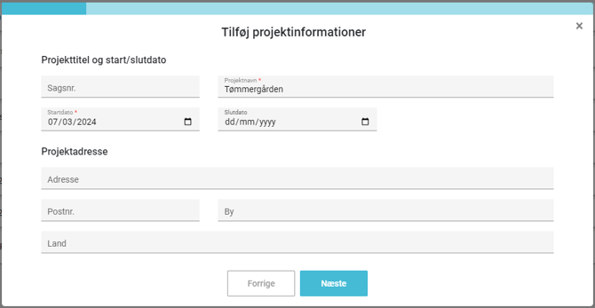 Her skal du som minimum vælge Projektnavn og Startdato. Derudover kan du give projektet et sagsnr., angive slutdato, samt adressen projektet foregår på.