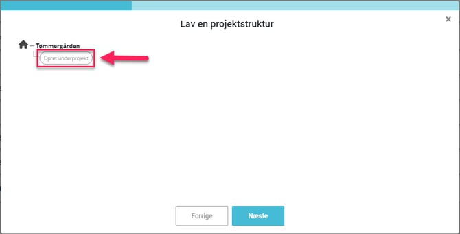 Vil du gerne inddele projektet i forskellige underprojekter, kan du her trykke på "Opret underprojekt", hvorefter du kan oprette et eller flere underprojekter og dermed skabe din projektstruktur.