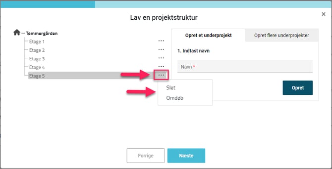 Ønsker du at slette eller omdøbe et af de underprojekter, du har oprettet, skal du trykke på de tre prikker til højre for underprojektet og vælge enten "Slet" eller "Omdøb".