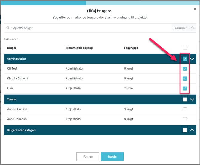 Tilknyt de brugere, der skal have adgang til projektet. Du vælger brugerne ved at sætte flueben i boksen til højre for dem. Hvis du gerne vil tilknytte en hel brugerkategori, kan du sætte flueben i boksen i den blå fane - så vil alle brugerne i kategorien blive markeret med flueben.