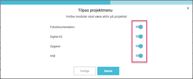 Vælg hvilke moduler, der skal være aktive på projektet. Benytter i fx ikke almindelig Fotodokumentation på dette projekt, giver det mening at deaktivere det, så overblikket på projektet i app'en og på administrationssiden kun viser relevante moduler og i undgår fejloprettede registreringer i uønskede moduler.