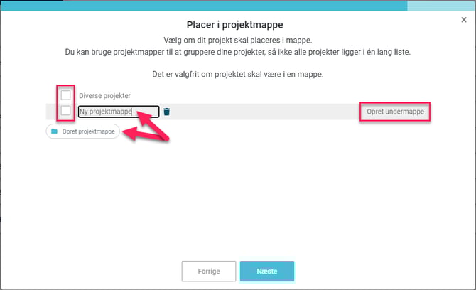 Ønsker du at placere projektet i en projektmappe, kan du vælge hvilken ved at sætte flueben i boksen til venstre for den. Har du endnu ikke oprettet nogen projektmapper eller ønsker du at oprette ekstra mappe, som dette projekt skal placeres i, kan du trykke på "Opret projektmappe" direkte fra dette overblik og navngive din nye mappe - du kan ligeledes oprette undermapper til eksisterende mapper.