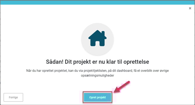 Tryk på "Opret projekt" for at færdigoprette dit nye projektet eller på "Forrige", hvis du ønsker at gå tilbage i flowet og kontrollere/ændre noget i de steps, du har været igennem.