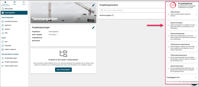 Tilføj skemaer, lav en kontrolplan, upload tegninger, tilknyt eksterne brugere osv. - vi hjælper dig med at huske det hele, hvis du følger vores Projekttjekliste, der dukker op i højre side af skærmen på din nye projektforside.
