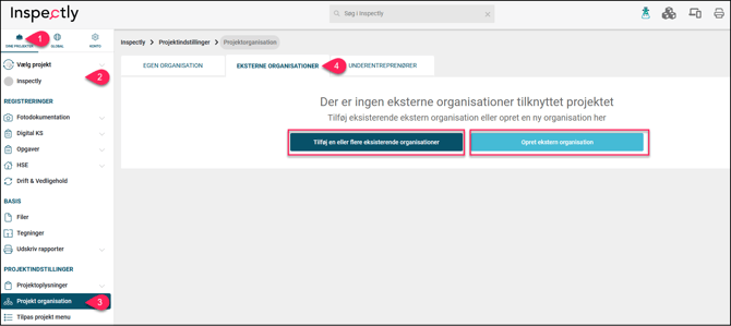 Dine projekter ➜ Vælg projekt ➜ Projektorganisation ➜ Eksterne organisationer