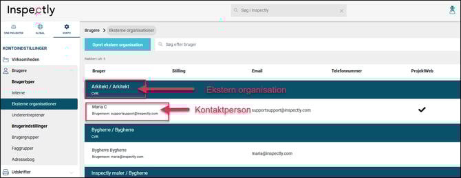 En ekstern organisation referer til en organisation der er uden for din virksomhed, som arbejder i/for eller samarbejder med. En ekstern organisation kan eksempelvis være: Bygherre, arkitekt, rådgivende ingeniør, byggeledelse, total-og hoved entreprenør. Du kan gratis oprette brugere til din eksterne organisationer, så de kan få adgang og følge med i de projekter/sager der er oprettet i Inspectly.
