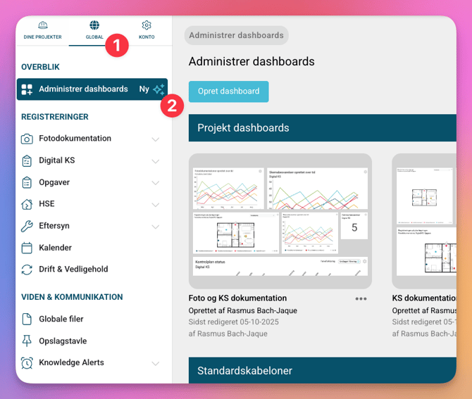 - Gå til Global → Administrer dashboards