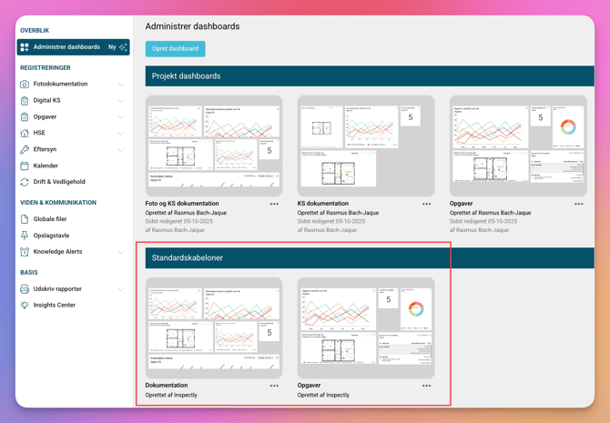 - Her finder du både dine oprettede dashboards og to standardskabeloner