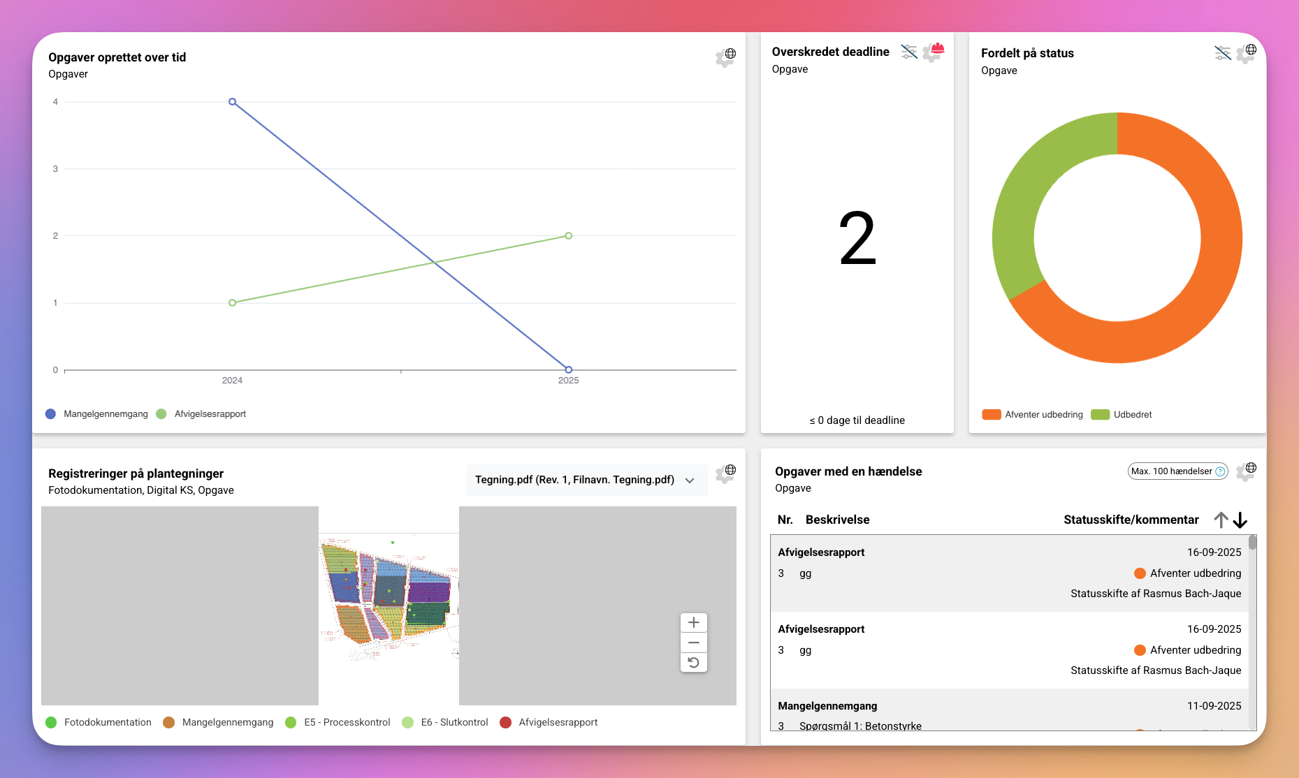 - Opgaver fordelt på status – Få overblik over opgavers fordeling på Oprettet, Udført, Lukket og Afvist