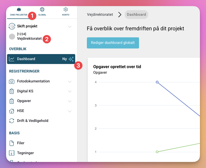 Rediger dashboard globalt: For at tilføje eller fjerne widgets skal du klikke "Rediger dashboard globalt" – ændringer påvirker alle projekter hvor dashboardet er tilknyttet.
