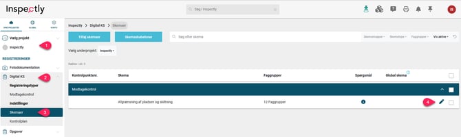Tryk på det projekt det drejer sig om ➜ Digital KS ➜ Indstillinger; Skemaer ➜ Tryk på blyanten ➜ Tilpas skemaet og ”Gem”