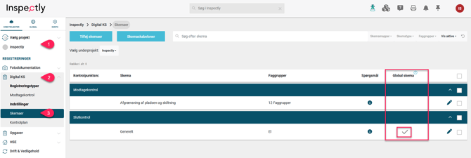 Tip: Hvis du er i tvivl om hvorvidt et skema er projektspecifikt eller globalt, kan du gå ind på det enkelte projekt. Er der et flueben ud for skemaet under "Global skema", er det et globalt skema.