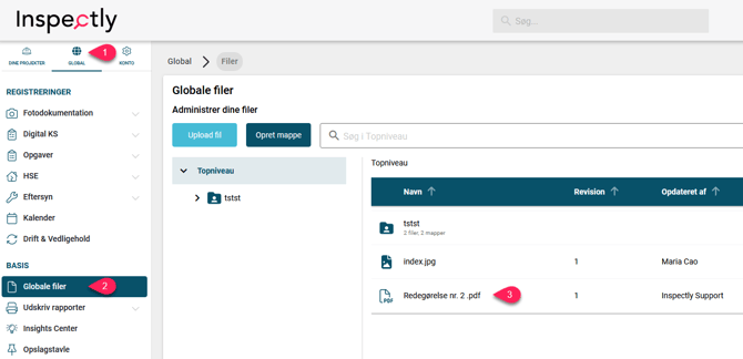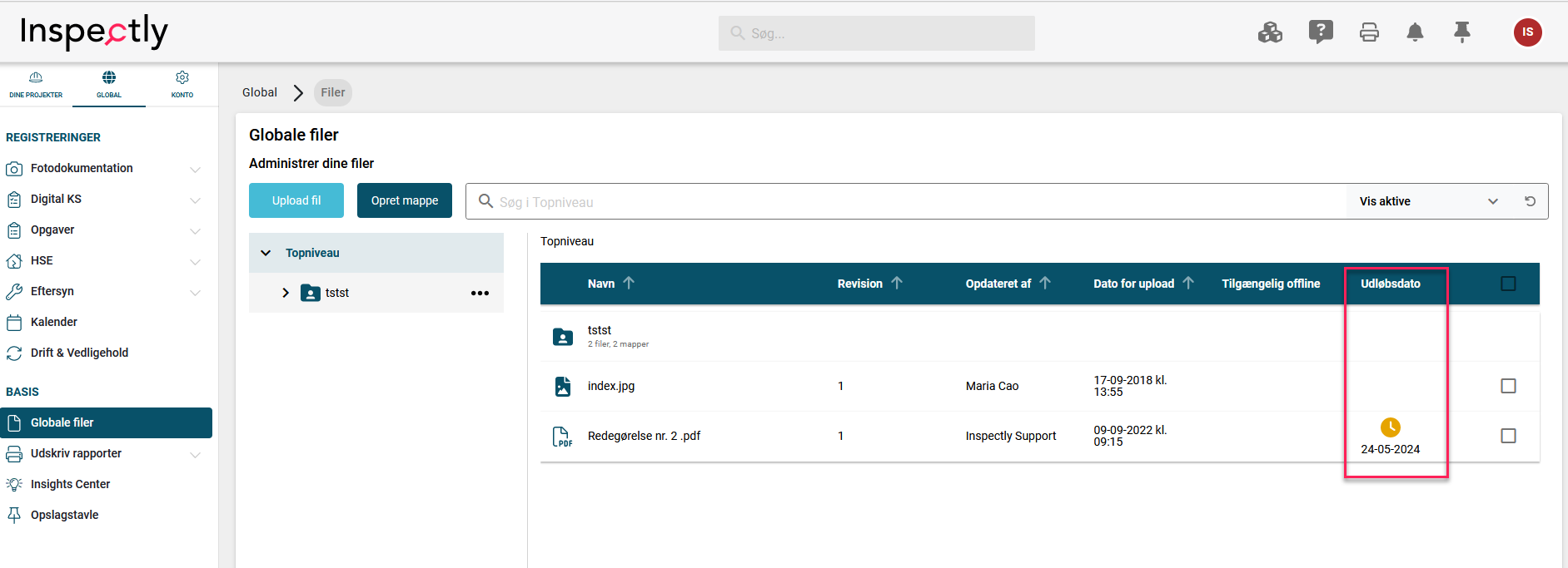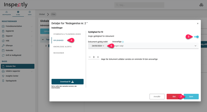 Global ➜ Globale filer ➜ Tryk på dokumentet det drejer sig om ➜ Tryk på "Gyldighed" ➜ Aktiver "Angiv gyldighed for dokument" ➜ Udfyld "Dokument gyldig indtil" ➜ Vælg evt. "Ansvarlige" (Vær OBS på, der kun kan vælges en ansvarlig med en Viden & Kommunikations licens) ➜ Vælg evt. om der skal sendes en reminder en vis antal dage før udløbsdato ➜ Gem