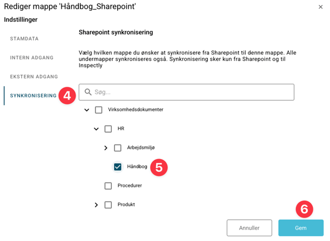 OBS! Hvis du redigerer din opsætning, og fjerner en eller flere mapper, vil det eksisterende indhold forblive i Inspectly, indtil du manuelt sletter det. Synkroniseringen vil dog stoppe, hvormed disse mapper ikke vil blive opdateret med eventuelt nyt indhold fra SharePoint.