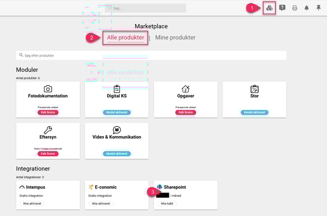 Tryk på Marketplace-ikonet øverst til højre på adminsiden, vælg "Alle produkter" og dernæst "Sharepoint" under afsnittet Integrationer: