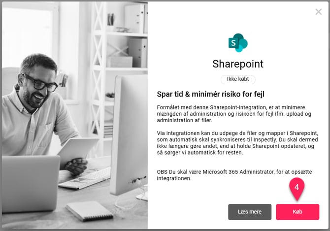 Vores SharePoint integration er en tilkøbsmulighed, der foretages direkte i Marketplace på Inspectly kontoen. Det er let og hurtigt at sætte op og kræver ikke en dedikeret IT-medarbejder, men har du brug for hjælp og vejledning så kontakt Inspectly Support.
