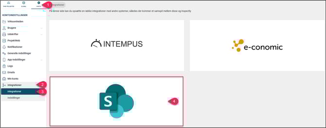 Du kan til enhver tid efter købet tilgå integrationssiden i Inspectly, hvorfra du laver opsætningen af SharePoint integrationen. På samme side kan du ligeledes redigere i opsætningen efter behov.