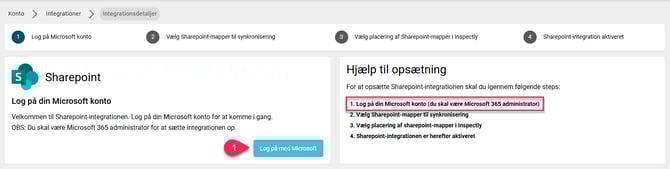 Når SharePoint integrationen skal opsættes første gang efter køb, skal man først aktivere integrationen ved at logge på jeres Microsoft-konto og tillade adgang mellem Inspectly og SharePoint. Dette kræver en medarbejder, der er Microsoft 365 administrator.