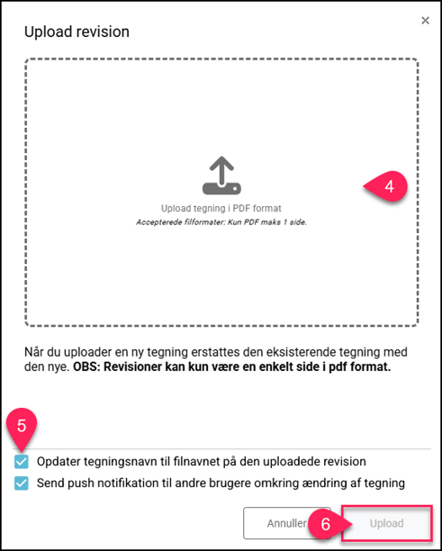 Vælg en tegning til upload ➜ Aktiver/deaktiver notifikation ➜ Aktiver/deaktiver opdatering af tegningsnavn ➜ Tryk på "Upload"