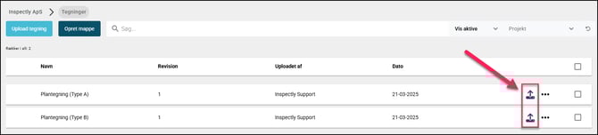Tryk på upload-ikonet ud for den tegning, du ønsker at uploade en ny revision af: