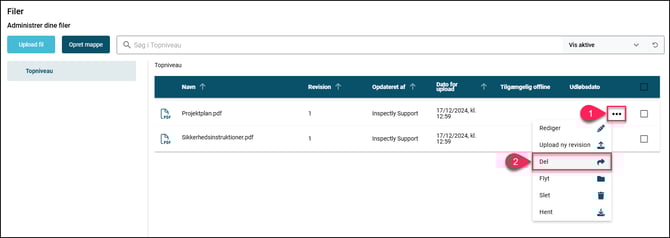 I menupunkterne "Globale filer" og "Filer" på projekter, er det muligt at generere et delingslink på hver enkelt fil, som du kan sende eller dele med alle dem, det er relevant for, fremfor at skulle vedhæfte filerne i mails eller uploade dem flere forskellige steder.