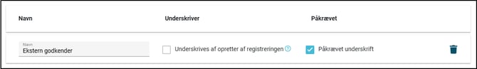 Den underskriftsrolle vi har opsat i dette eksempel er kaldet "Ekstern godkender" og er påkrævet, men skal ikke underskrives af brugeren, der laver skemabesvarelsen. Vi bliver derfor spurgt, om der er mulighed for at underskrive nu eller ej.