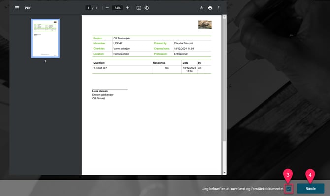 3. Sæt flueben i kassen "Jeg bekræfter, at have læst og forstået dokumentet", og