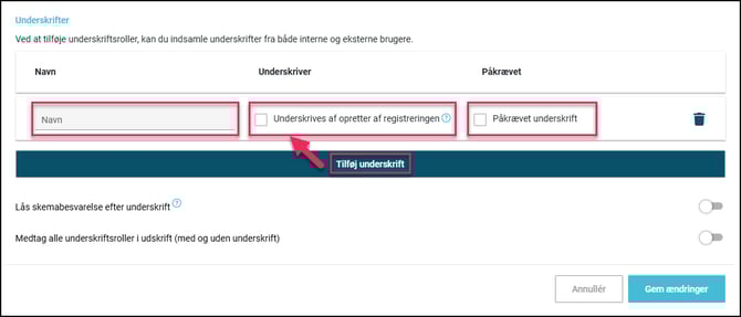 Tryk på knappen "Tilføj underskrift" for at tilføje underskriftsroller for hele skemaet, der kan eller skal udfyldes ifm. færdigmelding af skemaet.