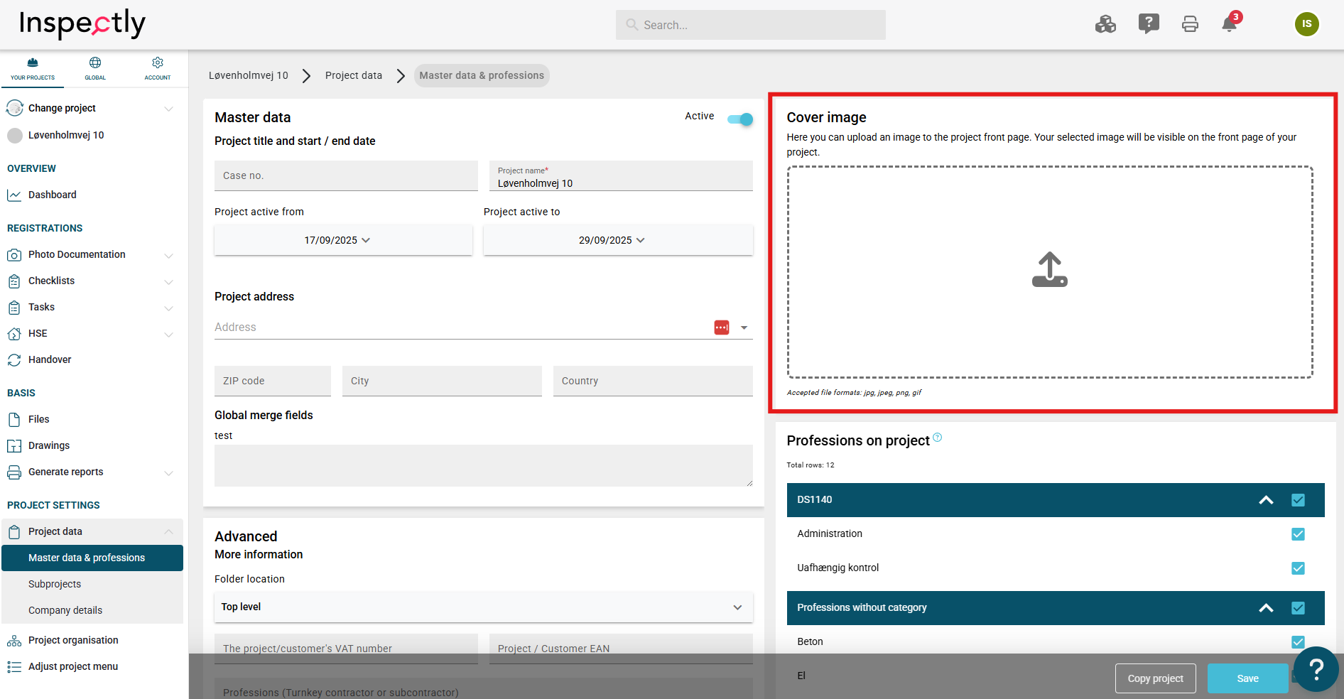 Go to the relevant project ➜ Project data ➜ Company details➜ Select an image under "Company Logo" ➜ Save