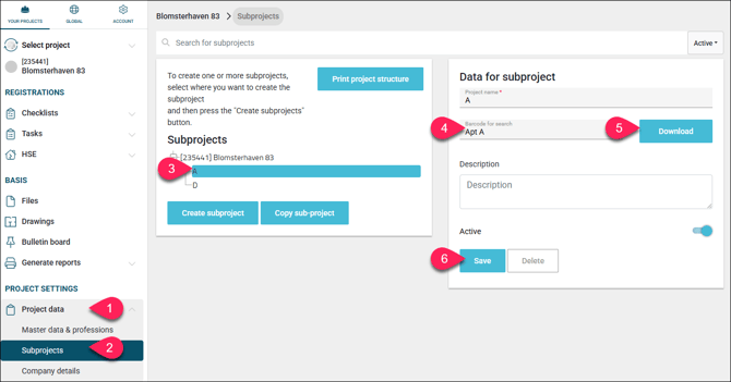 Project data > Subprojects > Select a subproject > Barcode for search > Download > Save