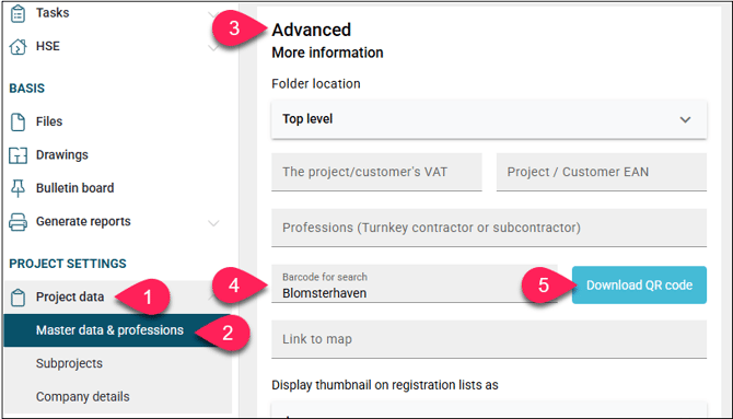 Project data > Master data & professions > Advanced > Barcode for search > Download QR code > Save