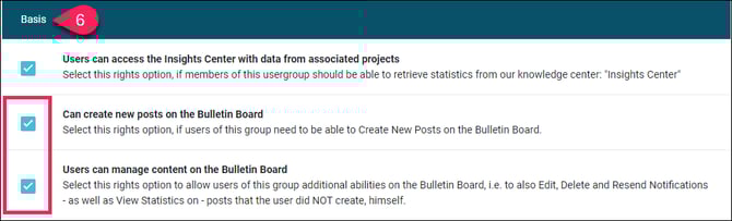 Select this permission if the users in this group should have additional permissions on the bulletin board. This permission allows editing, deleting, resending notifications, and viewing statistics on posts that the user did not create themselves.